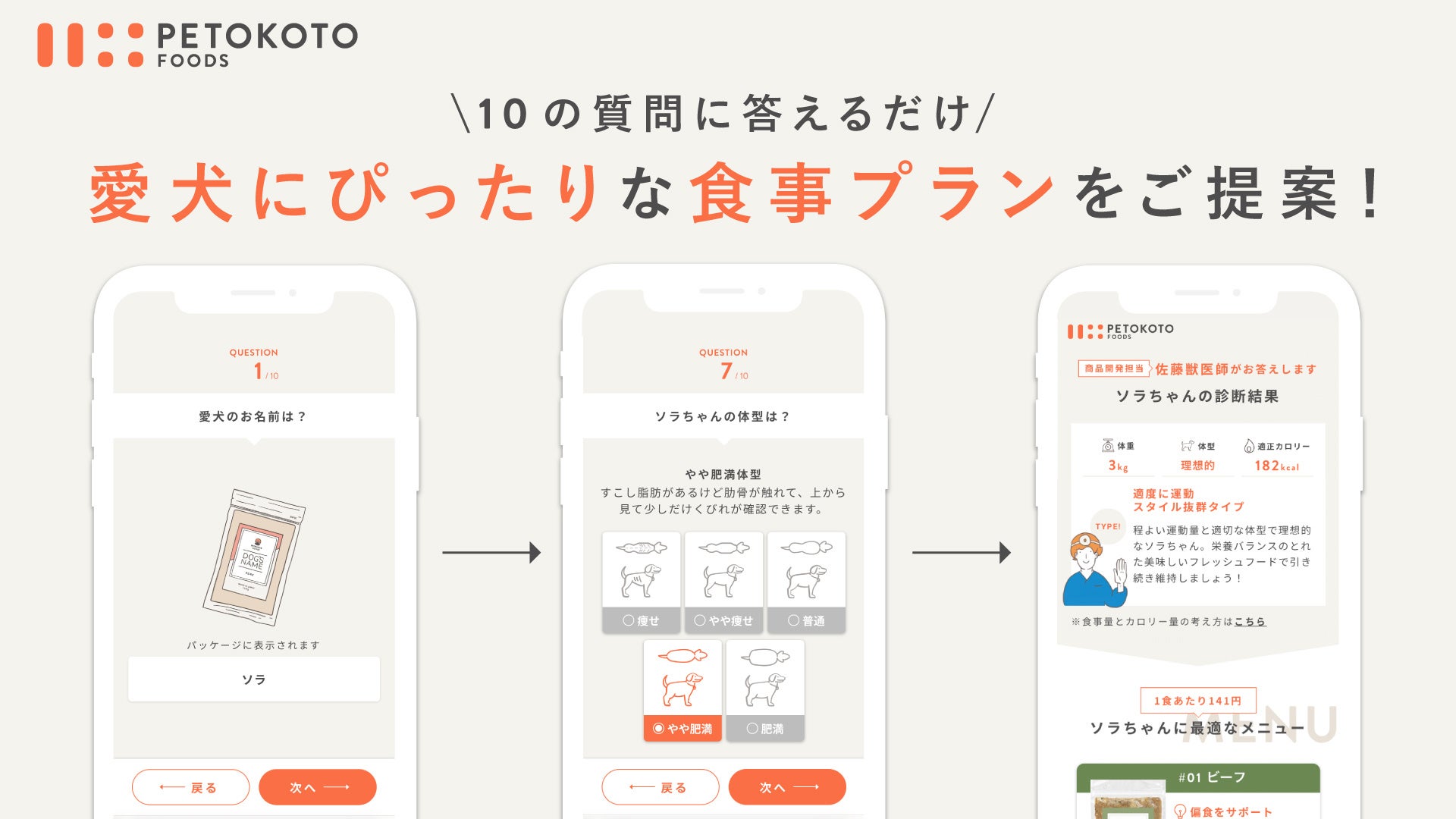 わずか1分、愛犬の体重・体型・運動量、アレルギーなど10個の質問に回答するだけで最適な摂取カロリー量やメニューのフードプランを提案。パックごとに愛犬の名前を貼ってご自宅にごはんが切れる前にお届けします。